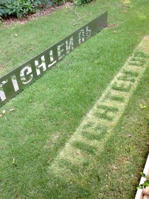 This piece consists of concrete letters cast from five inch by one inch thick silicone molds, which are then ground and hand sanded to distinct angles. The resulting forms were placed on the sidewalk so that the letterforms appear to be