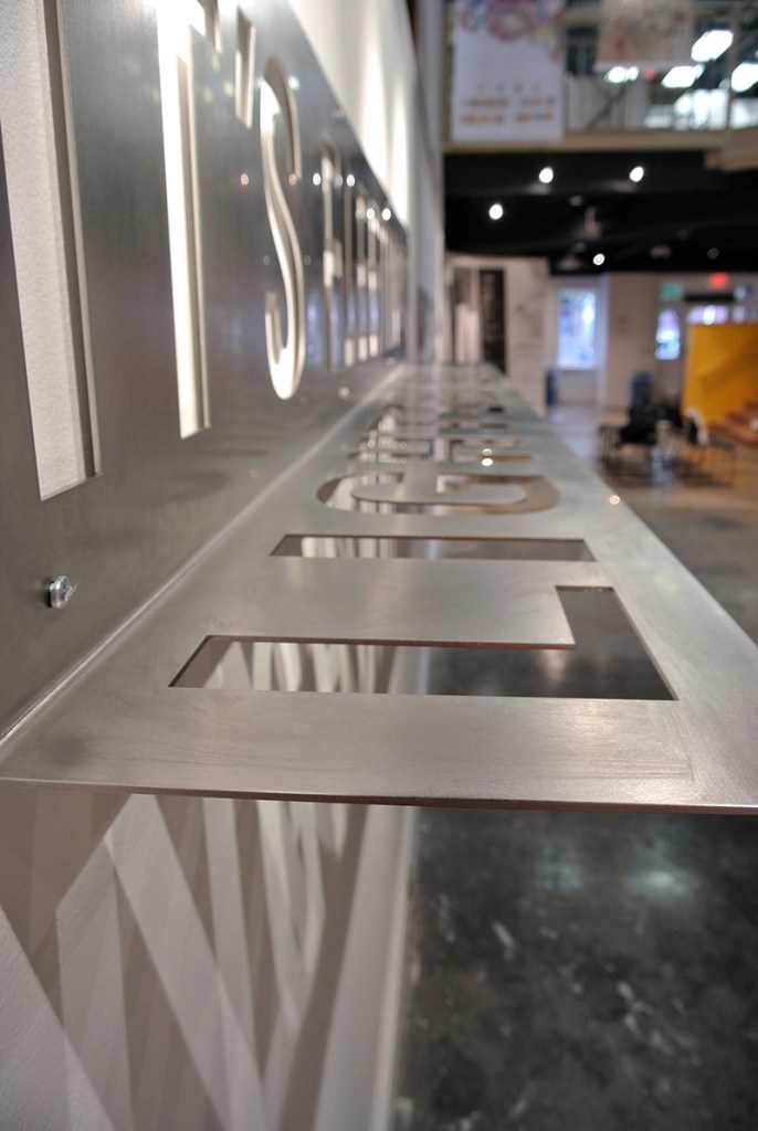 It’s Fleeting/Lighten Up is a typographic installation designed to reveal a message as it interacts with sunlight. Laser-cut into a sheet of stainless steel bent at a ninety degree angle, the piece presents two phrases, “IT’S FLEETING,” and “LIGHTEN UP.” Installed at eye level and flush against the wall, “IT’S FLEETING” is always be visible and “LIGHTEN UP” is revealed as shadow as the sun passes overhead. If the weather/lighting is cooperative, this stranger will share its secret with you.