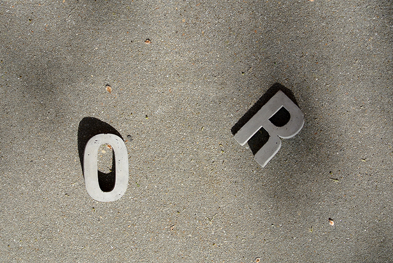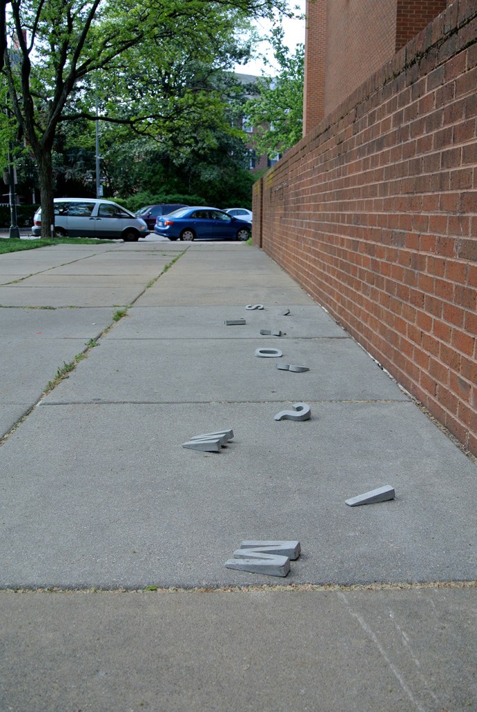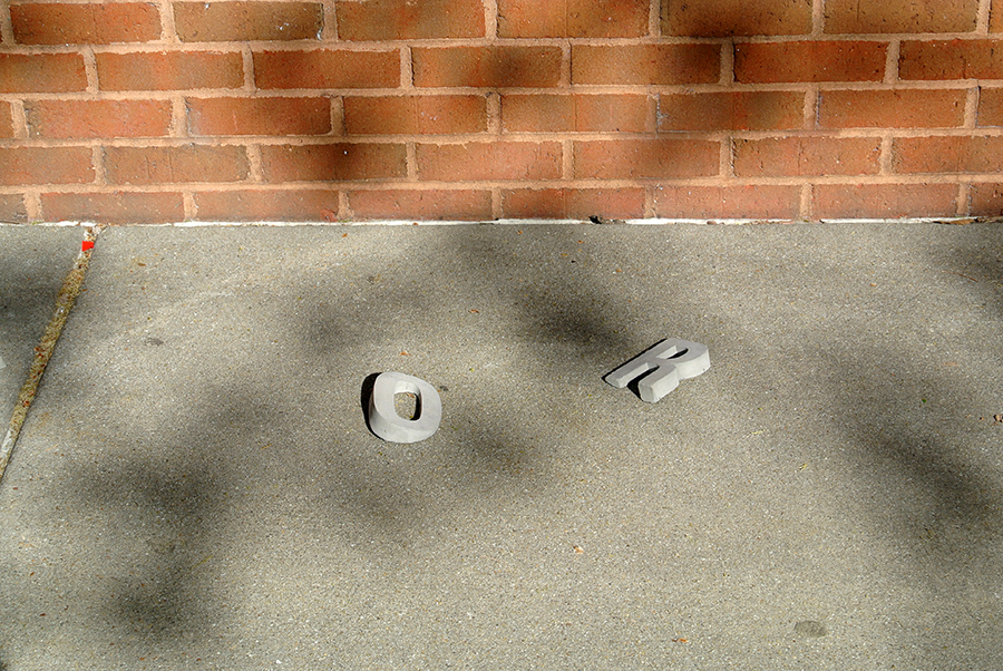 This piece consists of concrete letters cast from five inch by one inch thick silicone molds, which are then ground and hand sanded to distinct angles. The resulting forms were placed on the sidewalk so that the letterforms appear to be sinking as they deliver an apt message for the final weeks of the school year: It’s time to either buckle down and end the year strong, or sink and finish with a lackluster performance.