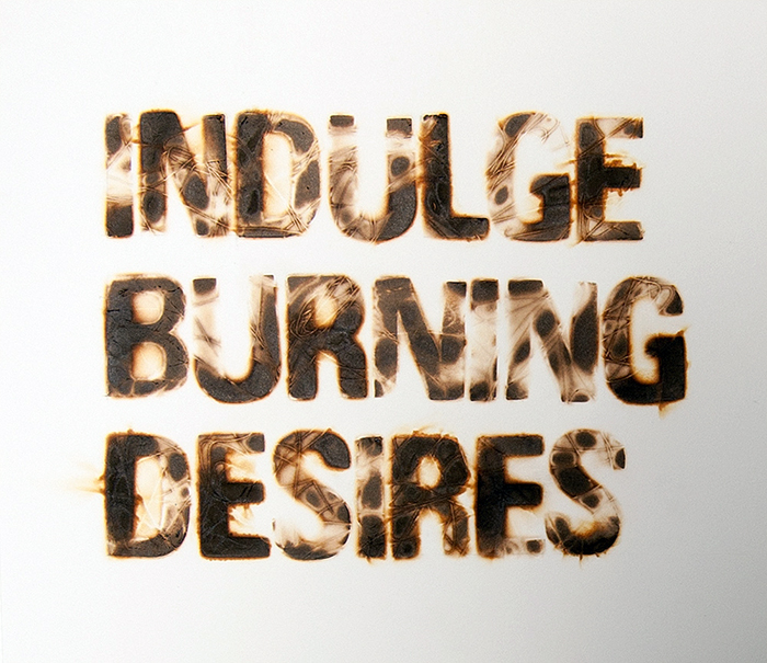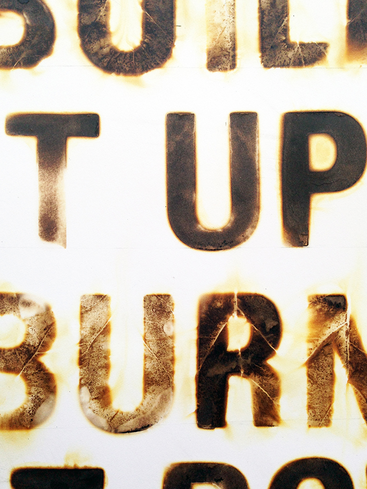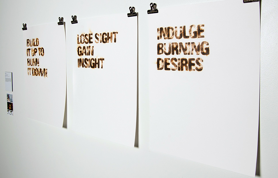 I experimented with different papers, materials, and branding methods. When misted with water, papers with a high rag content produced a hazy burn when branded. To explore textures, I burned through objects like leaves and linen thread. The results were exciting and unpredictable. I used the brands to create a series of posters with messages celebrating the process: Build It Up to Burn It Down, Indulge Burning Desires, and Lose Sight/Gain Insight.