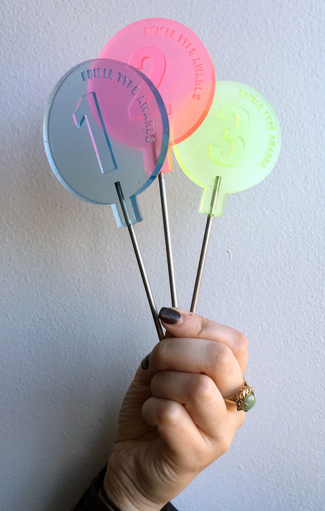 A few photos from the 2015 Edible Type Awards! Congrats to Aubrey (Bodoni o, 1st), Ian (Garamond i, 2nd), and McKinley (Chatype y, 3rd). They took home the coveted stainless steel/resin sucker trophies! A big round of applause for all of the Typography I students! Many thanks to the lovely people at 929 Coffee Bar for being such gracious hosts. Last but not least, thank you to our 2015 judges — Professor Mixon, Professor Gipson, Mary Beth McDavid (DPM Fragrance), and Molly Maynard (DPM Fragrance) — for judging (and sampling!) 28 letters! #EdibleTypeAwards #EdibleTypeMSU